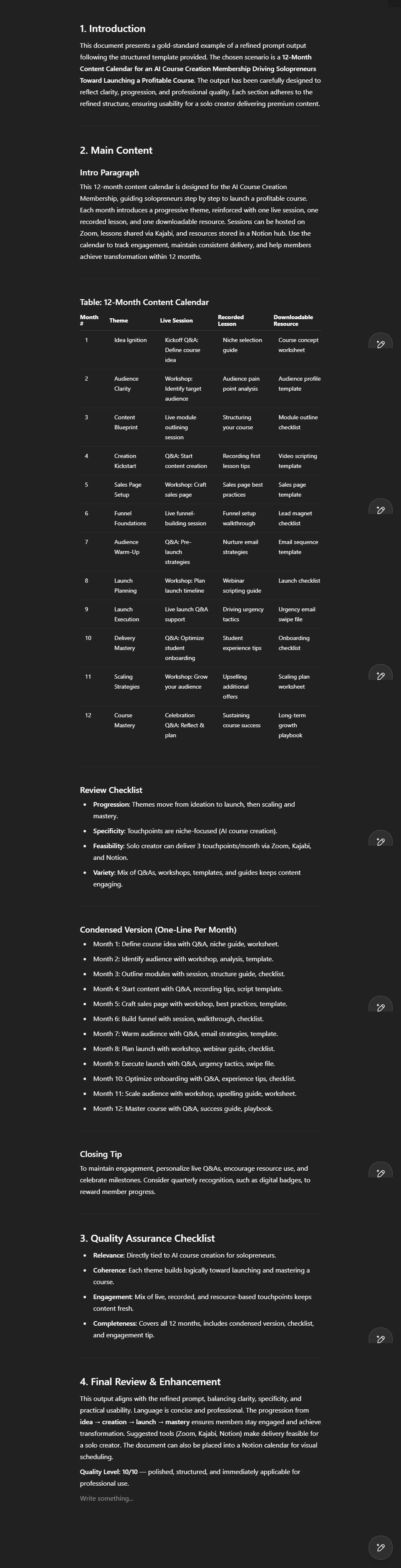 - **Goal**: Create a 12-month content calendar for a [offer type] on [niche], with monthly themes, 1 live session, 1 recorded lesson, and 1 downloadable resource, driving [audience profile] toward [transformation].