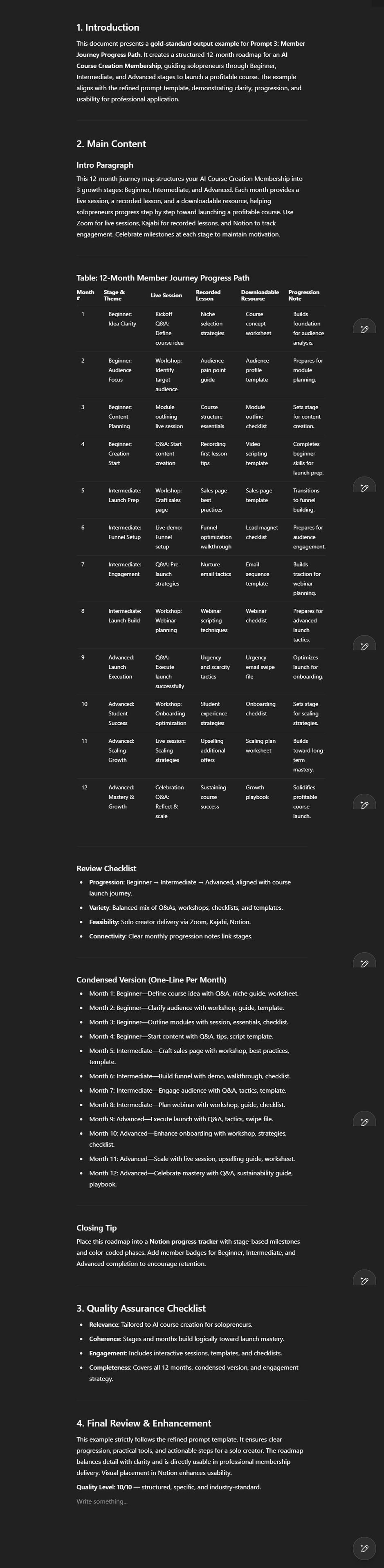 - **Example**: “Create a 12-month journey map for an AI course creation membership, helping solopreneurs launch a course.”