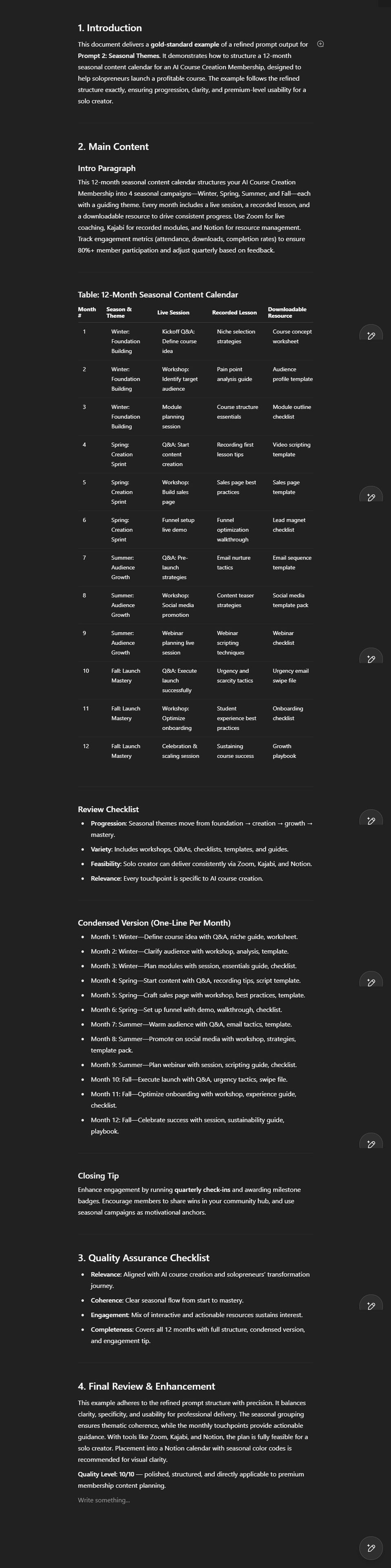 Verdict: Memberships thrive on rhythm and progression. With AI prompts, you can map out an entire year in minutes—freeing you up to focus on delivering transformation, not just “more stuff.”
